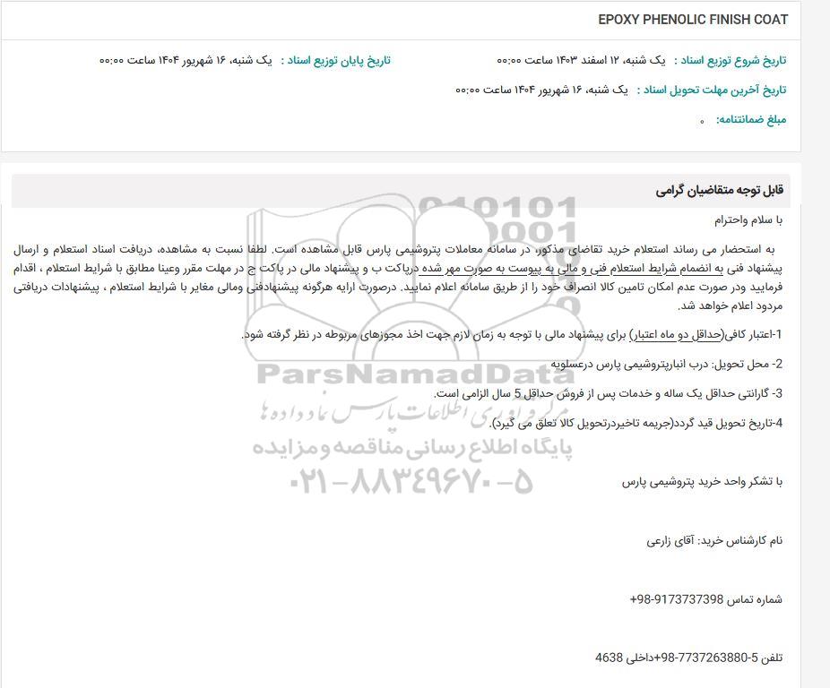 استعلام بها و موضوع استعلام استعلام EPOXY PHENOLIC FINISH COAT به اطلاع کلیه شرکتها و افراد متخصص واجد شرایط میرساند، آگهی گذار در نظر دارد از طریق استعلام بها، نسبت به انتخاب و دریافت پیشنهادات اقدام نماید. این استعلام با کد آگهی ثبت شده در سامانه خبرگزاری پارس نماد : 9500619 منتشر شده است. مشخصات استعلام : تاریخ شروع استعلام: 1404/06/13 آخرین مهلت ارسال پیشنهاد قیمت : 1404/06/16 و محل اجرای پروژه : استان بوشهر میباشد. استعلام قیمت مورد درخواست : استعلام EPOXY PHENOLIC FINISH COAT با دستهبندیهای تخصصی و گروه های مرتبط : انواع پوشش پلیمری، اپکسی، عایق کاری صنعتی, صنایع رنگ،رزین و چسب, استعلام اطلاع رسانی میگردد. شرایط شرکت در استعلام آنلاین : ابتدا ثبت نام در سامانه استعلام پارس نماد و تکمیل مدارک موردنیاز و بارگذاری در سامانه رعایت تمامی ضوابط و الزامات مندرج در اسناد استعلام است.