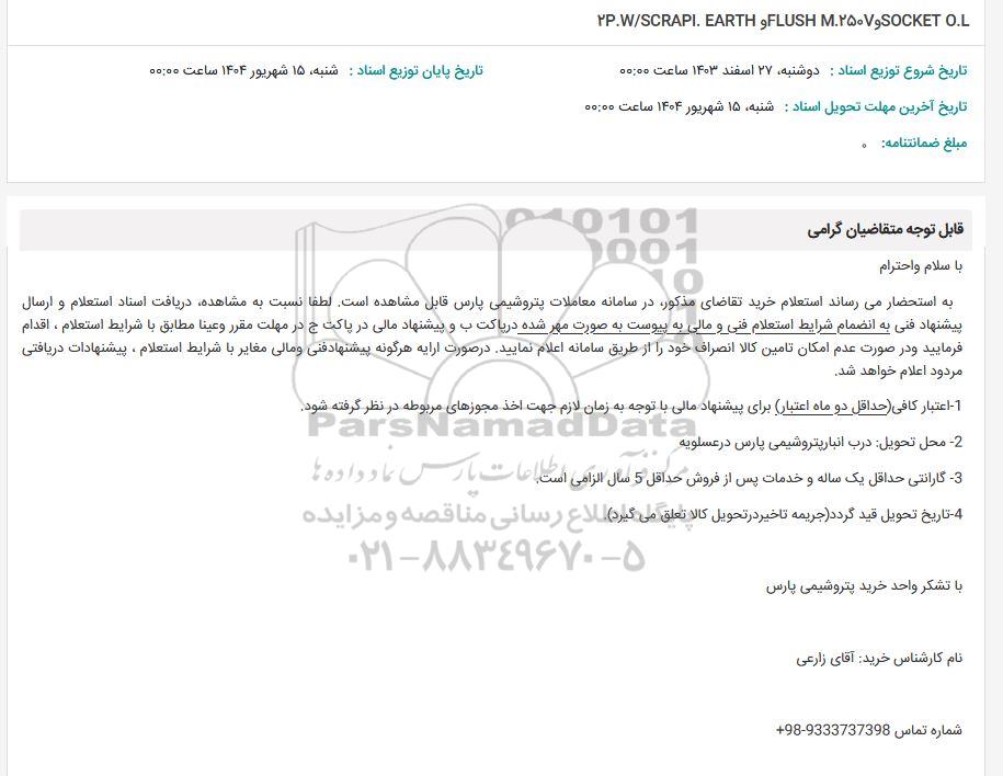به استحضار می رساند استعلام خرید تقاضای مذکور در سامانه معاملات پتروشیمی پارس قابل مشاهده است. لطفا نسبت به مشاهده دریافت اسناد استعلام و ارسال پیشنهاد فنی به انضمام شرایط استعلام فنی و مالی به پیوست به صورت مهر شده در پاکت ب و پیشنهاد مالی در پاکت ج در مهلت مقرر وعينا مطابق با شرایط استعلام ، اقدام فرمایید و در صورت عدم امکان تامین کالا انصراف خود را از طریق سامانه اعلام نمایید در صورت ارایه هرگونه پیشنها دفنی و مالی مغایر با شرایط استعلام ، پیشنهادات دریافتی مردود اعلام خواهد شد.