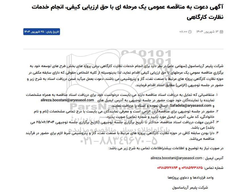 شرکت پلیمر آریاساسول (سهامی عام) در نظر دارد برای انجام خدمات نظارت کارگاهی برخی پروژه های بخش طرحهای توسعه خود به برگزاری مناقصه عمومی یک مرحلهای با حق ارزیابی کیفی اقدام نماید لذا بدینوسیله از کلیه اشخاص حقوقی که دارای سابقه مکفی در حوزه نظارت کارگاهی پروژه های مرتبط با صنعت نفت گاز و پتروشیمی میباشند دعوت بعمل میآید ضمن دریافت اسناد به شرح زیر و حضور در جلسه توجیهی (الزامی) مطابق اسناد اقدام فرمایند.