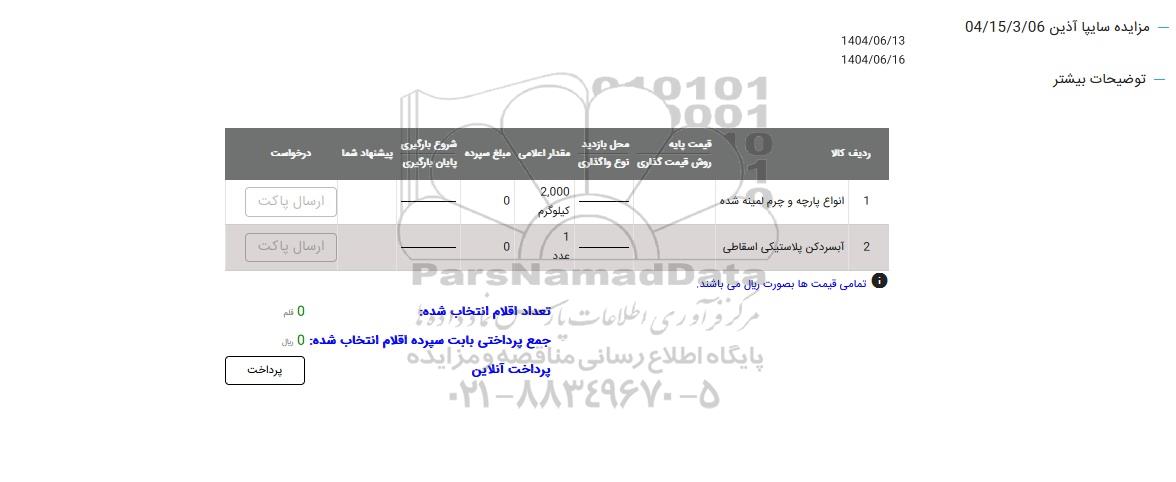 مزایده عمومی مزایده انواع پارچه و چرم لمینه شده برگزار میگردد. از کلیه افراد متخصص و شرکتهای واجد شرایط دعوت به عمل میآید تا در این مزایده با کد خبرگزاری پارس نماد : 9500627 شرکت نمایند تاریخ شروع مزایده : 1404/06/13 مهلت شرکت در مزایده: تا پایان روز 1404/06/16
