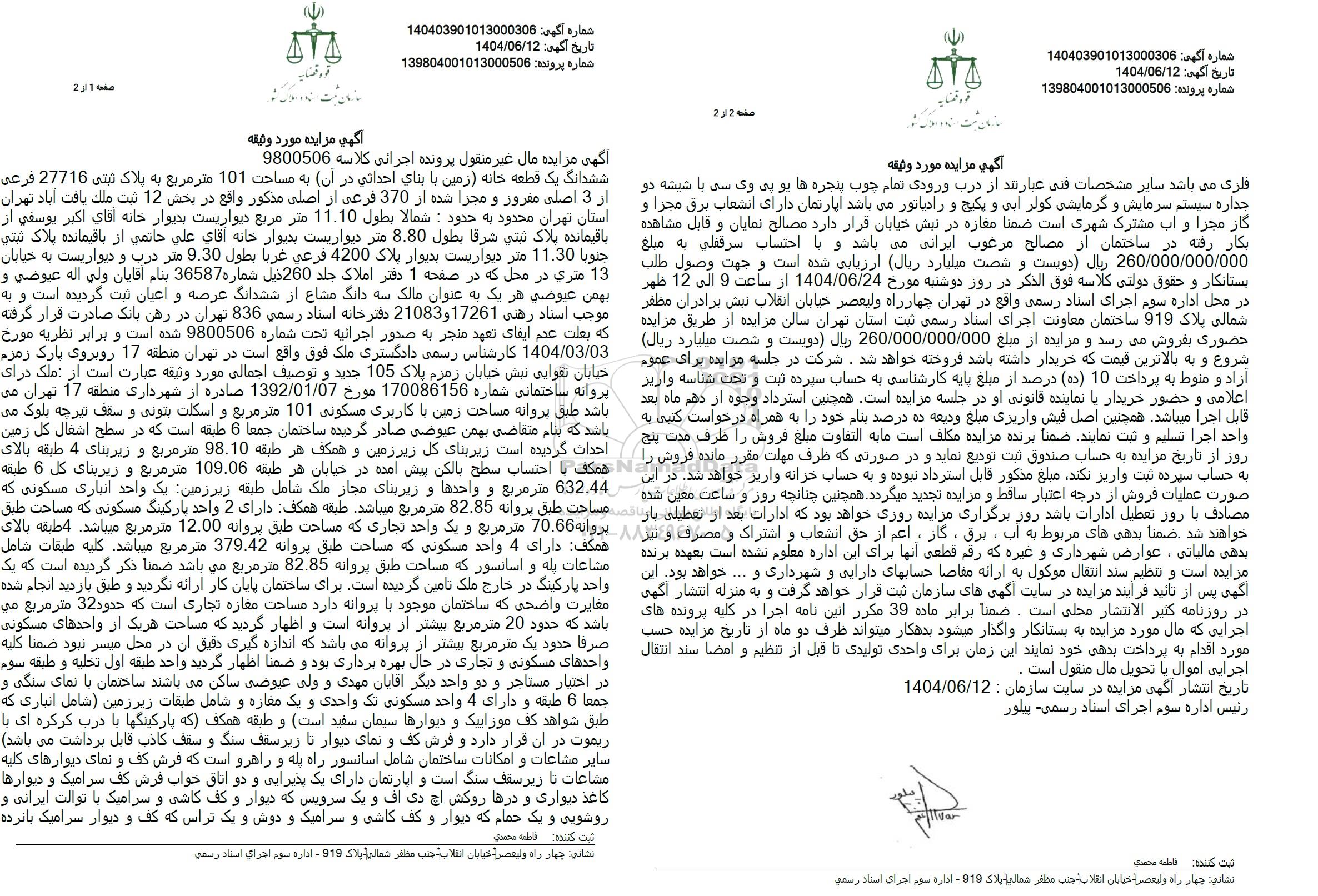 13 مزایده پنج دانگ مشاع از ششدانگ یک قطعه آپارتمان نوع ملک طلق به پلاک ثبتی 6320 فرعی از 111 اصلی 9742299 1404/08/01 new not special not payed تهران
