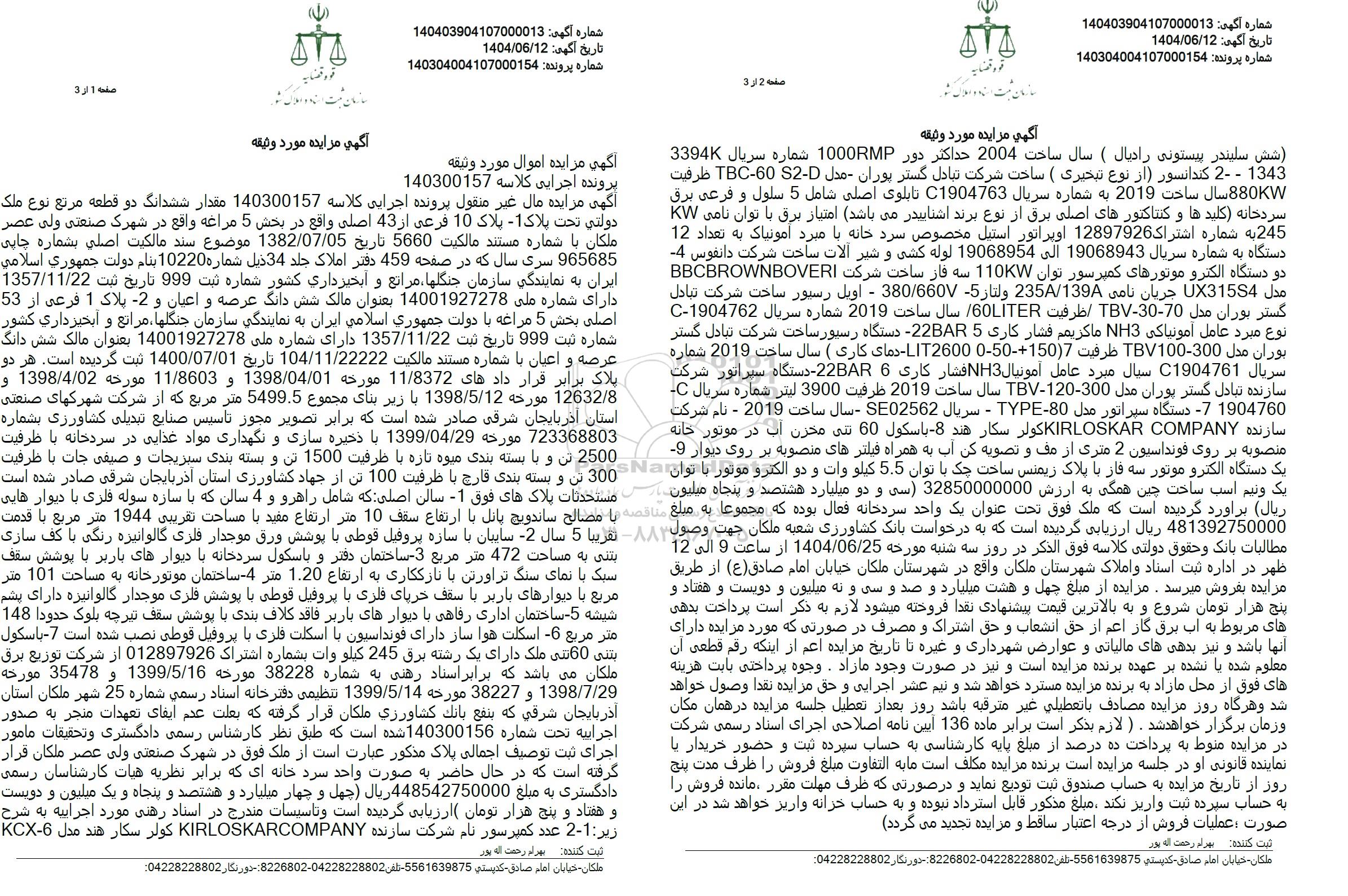 مزایده فروش دو قطعه مرتع به پلاک 10 فرعی از 43 اصلی بهمساحت 5499.5 مترمربع و وسایلی شامل : کندانسور، باسکول 60 تنی، دستگاه سپراتور ، ......
