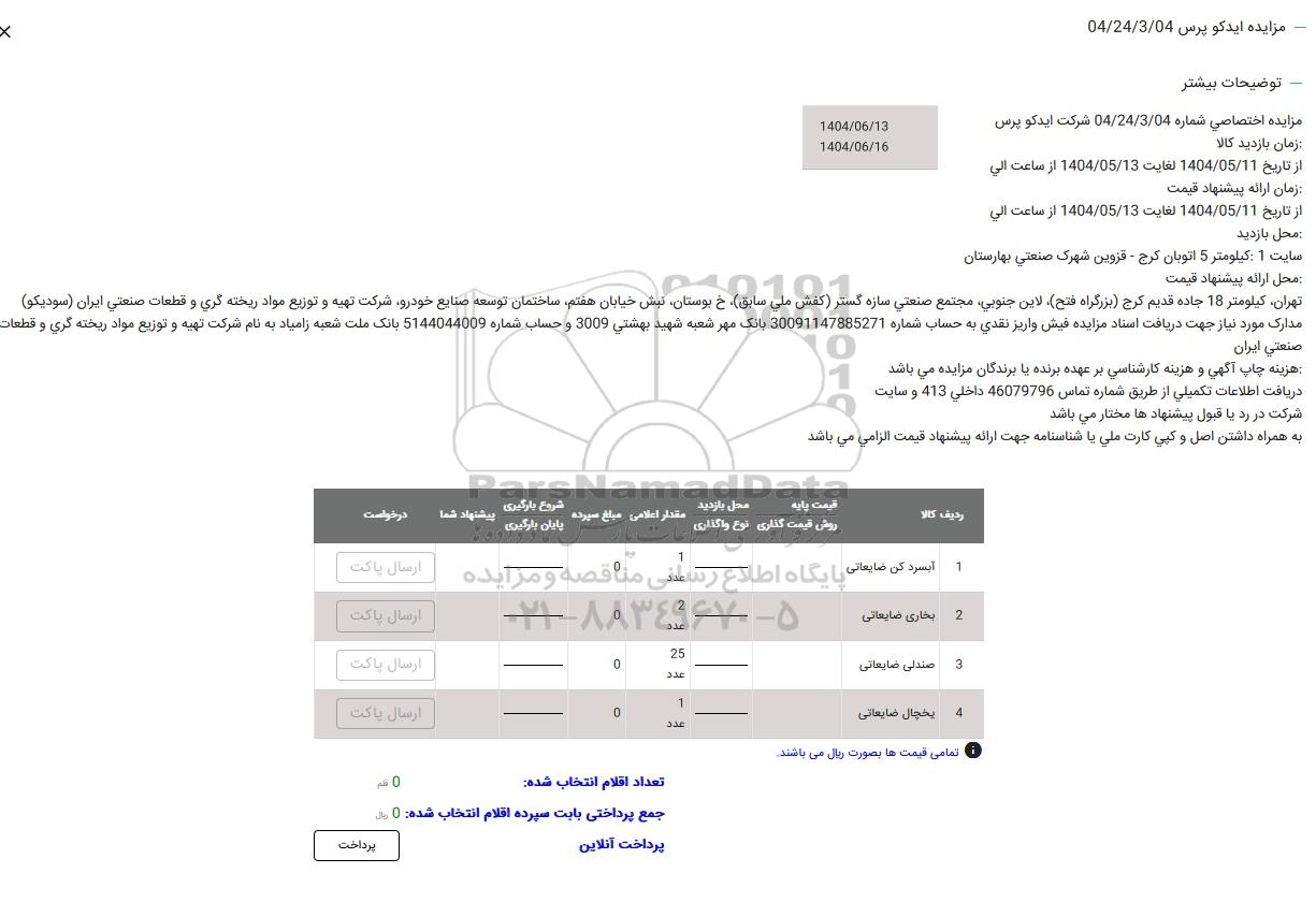 مزایده عمومی مزایده آبسردکن ضایعاتی  برگزار میگردد. از کلیه افراد متخصص و شرکت‌های واجد شرایط دعوت به عمل می‌آید تا در این مزایده با کد خبرگزاری پارس نماد : 9500643 شرکت نمایند تاریخ شروع مزایده : 1404/06/13 مهلت شرکت در مزایده: تا پایان روز 1404/06/16 مکان برگزاری اموال واگذاری استان‌های تهران و دسته‌بندی‌های مربوط به این حراجی متفرقه میباشد. اطلاعات دقیق‌تر درباره شرایط شرکت در مزایده آنلاین و نحوه ارسال مدارک، الزامات پروژه و دریافت اسناد مزایده و تاریخ بازگشایی پاکت‌ها، در بخش اطلاعات تکمیلی این آگهی درج شده است.
