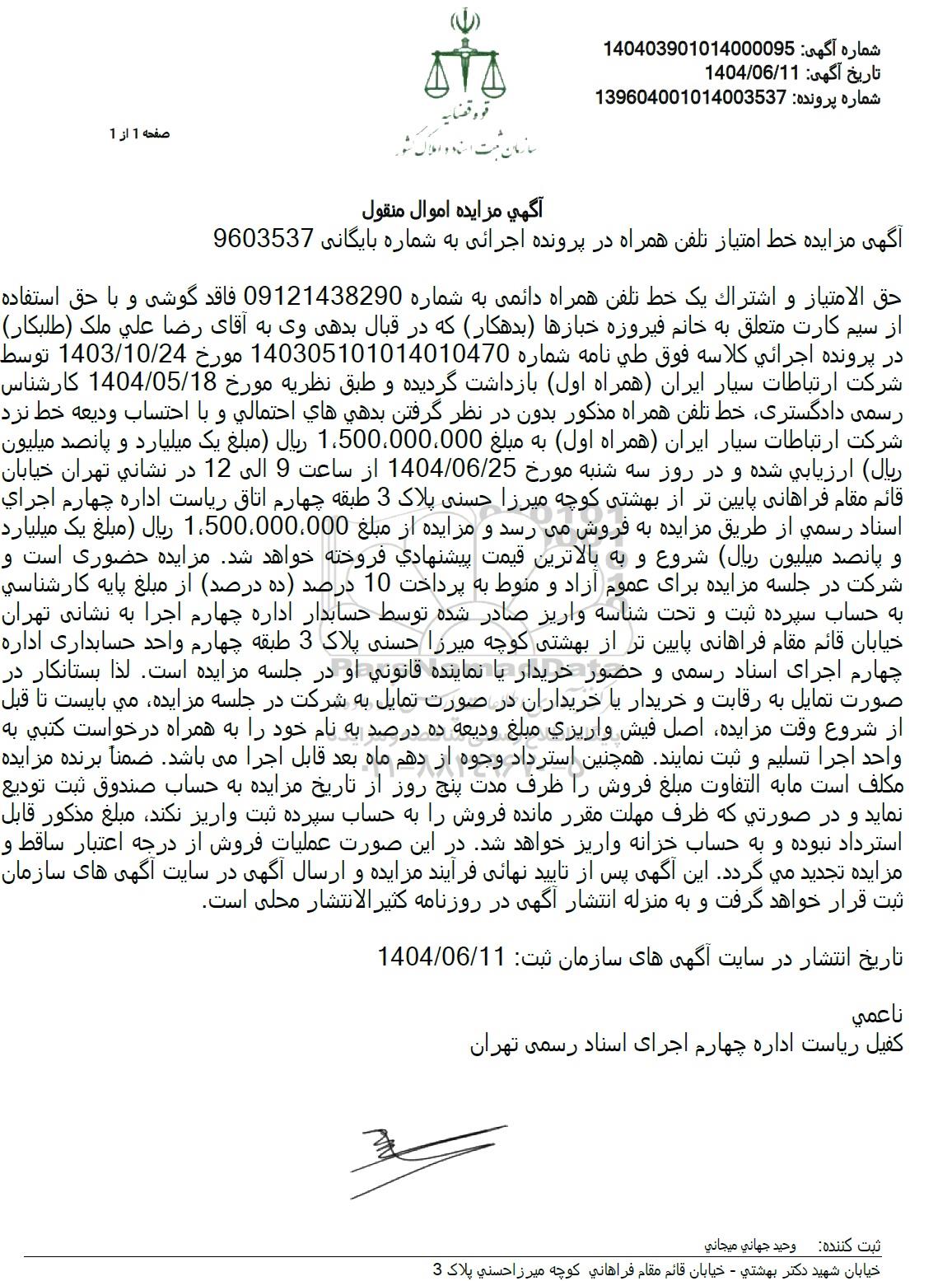 مزایده فروش تلفن همراه دائمی به شماره 09121438290 به مبلغ 1.500.000.000 ریال