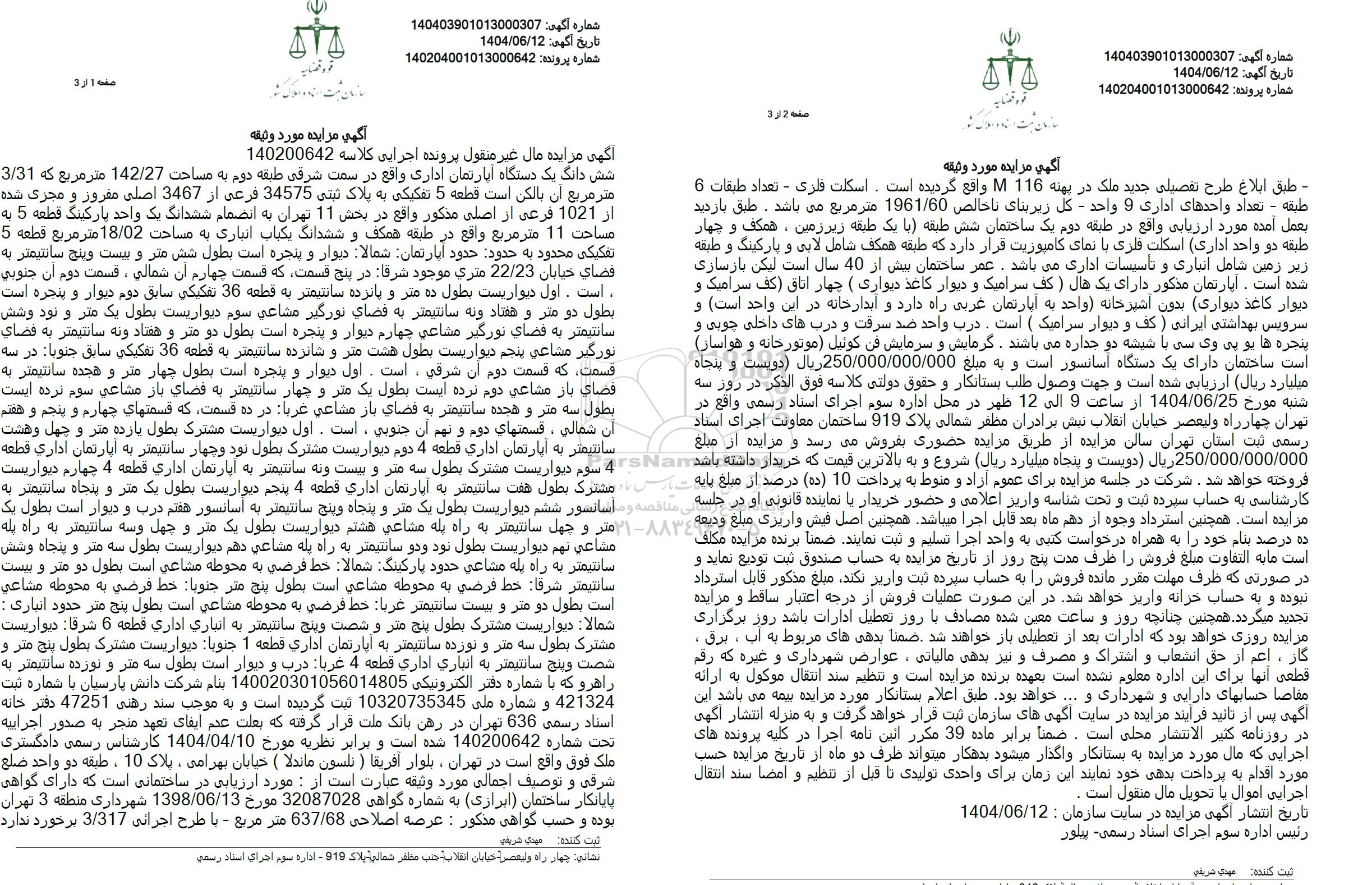 مزایده ششدانگ یک دستگاه آپارتمان مساحت 142.27 مترمربع