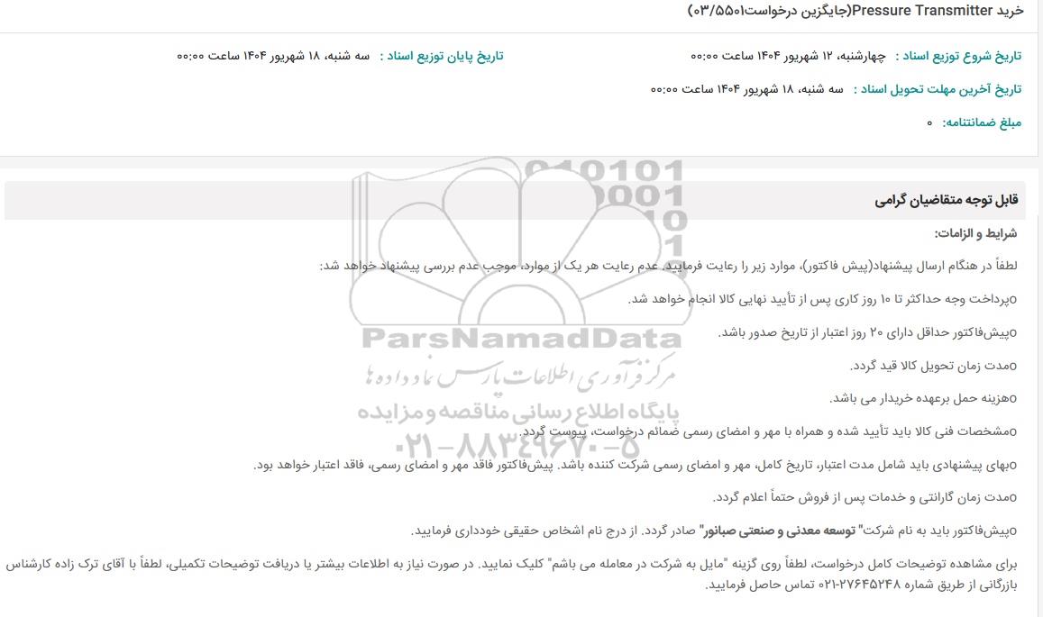 استعلام بها و موضوع استعلام استعلام خرید Pressure4 Transmitter به اطلاع کلیه شرکتها و افراد متخصص واجد شرایط میرساند، آگهی گذار در نظر دارد از طریق استعلام بها، نسبت به انتخاب و دریافت پیشنهادات اقدام نماید. این استعلام با کد آگهی ثبت شده در سامانه خبرگزاری پارس نماد : 9500651 منتشر شده است. مشخصات استعلام : تاریخ شروع استعلام: 1404/06/13 آخرین مهلت ارسال پیشنهاد قیمت : 1404/06/18 و محل اجرای پروژه : استان تهران میباشد. استعلام قیمت مورد درخواست : استعلام خرید Pressure4 Transmitter با دستهبندیهای تخصصی و گروه های مرتبط : ابزار دقیق, ترانسفورماتور, تجهیزات و ماشین آلات صنعتی, تجهیزات و ماشین آلات حفاری, تجهیزات برق و الکترونیک, استعلام اطلاع رسانی میگردد. شرایط شرکت در استعلام آنلاین : ابتدا ثبت نام در سامانه استعلام پارس نماد و تکمیل مدارک موردنیاز و بارگذاری در سامانه رعایت تمامی ضوابط و الزامات مندرج در اسناد استعلام است.
