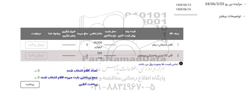 مزایده عمومی مزایده اقلام ضایعاتی درهم برگزار میگردد. از کلیه افراد متخصص و شرکت‌های واجد شرایط دعوت به عمل می‌آید تا در این مزایده با کد خبرگزاری پارس نماد : 9500653 شرکت نمایند تاریخ شروع مزایده : 1404/06/13 مهلت شرکت در مزایده: تا پایان روز 1404/06/16 مکان برگزاری اموال واگذاری استان‌های تهران و دسته‌بندی‌های مربوط به این حراجی پلاستیک ، پلی اتیلن و مستر بچ, متفرقه میباشد. اطلاعات دقیق‌تر درباره شرایط شرکت در مزایده آنلاین و نحوه ارسال مدارک، الزامات پروژه و دریافت اسناد مزایده و تاریخ بازگشایی پاکت‌ها، در بخش اطلاعات تکمیلی این آگهی درج شده است.