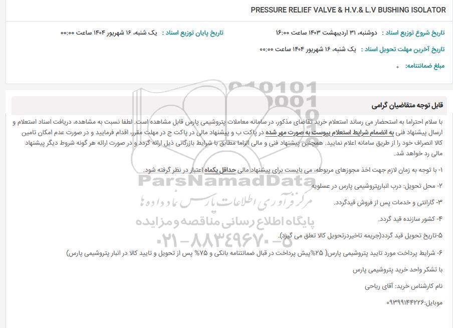 با سلام احتراما به استحضار میرساند استعلام خرید تقاضای مذکور در سامانه معاملات پتروشیمی پارس قابل مشاهده است. لطفا نسبت به مشاهده دریافت اسناد استعلام و ارسال پیشنهاد فنی به انضمام شرایط استعلام پیوست به صورت مهر شده در پاکت ب و پیشنهاد مالی در پاکت ج در مهلت مقرر اقدام فرمایید و در صورت عدم امکان تامین کالا انصراف خود را از طریق سامانه اعلام نمایید. همچنین پیشنهاد فنی و مالی الزاما مطابق با شرایط بازرگانی ذیل ارائه گردد و در صورت ارائه هر گونه شروط دیگر پیشنهاد مالی رد خواهد شد.