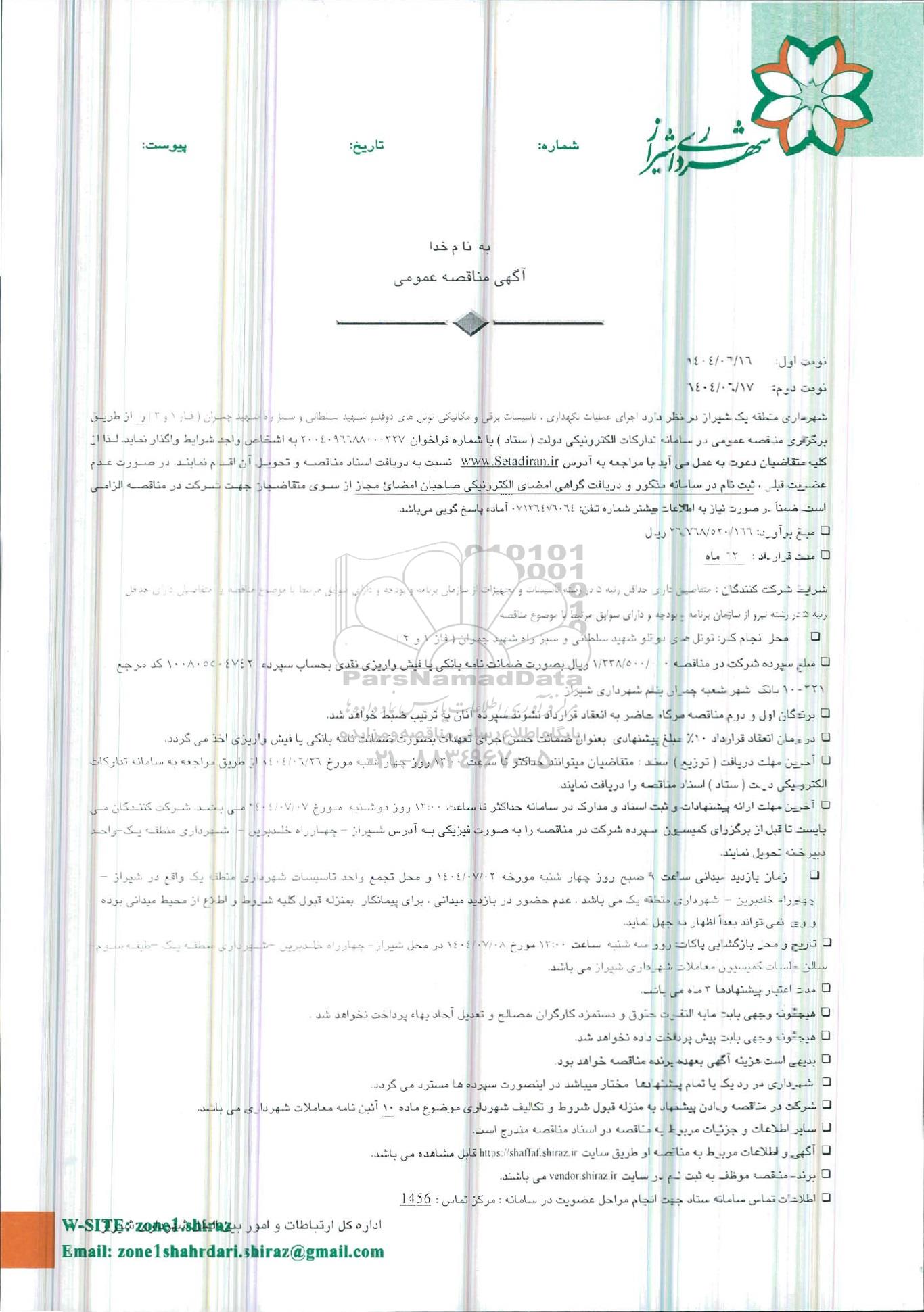 - آگهی و اطلاعات مربوط به مناقصه از طریق سایت https://shaffaf.shiraz.ir قابل مشاهده می باشد.