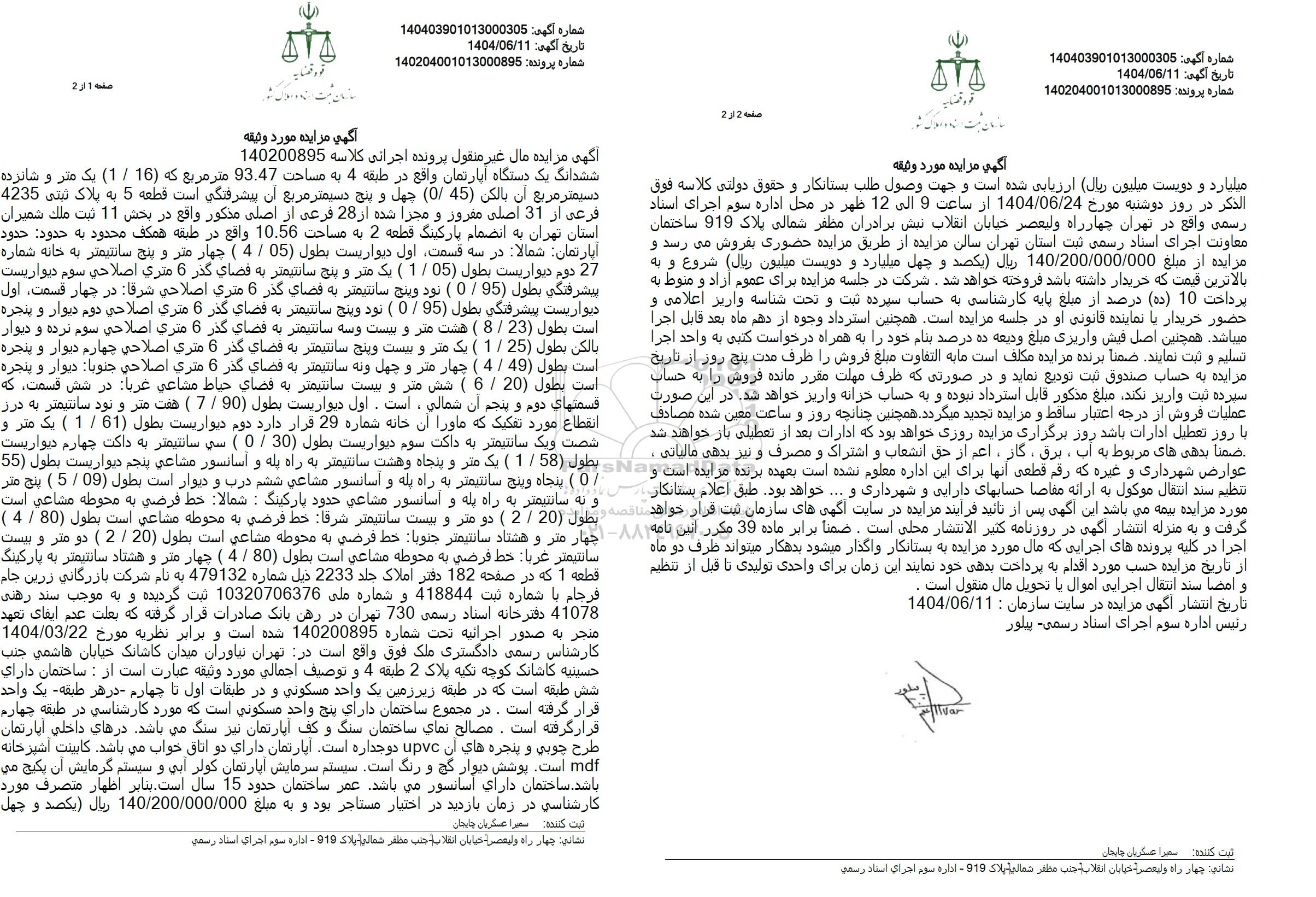 تاریخ مزایده روز دوشنبه مورخ 1404.06.24 از ساعت 9 الی 12 ظهر در محل اداره سوم اجرای اسناد رسمی واقع در تهران چهارراه ولیعصر خیابان انقلاب نبش برادران مظفر شمالی پلاک 919
