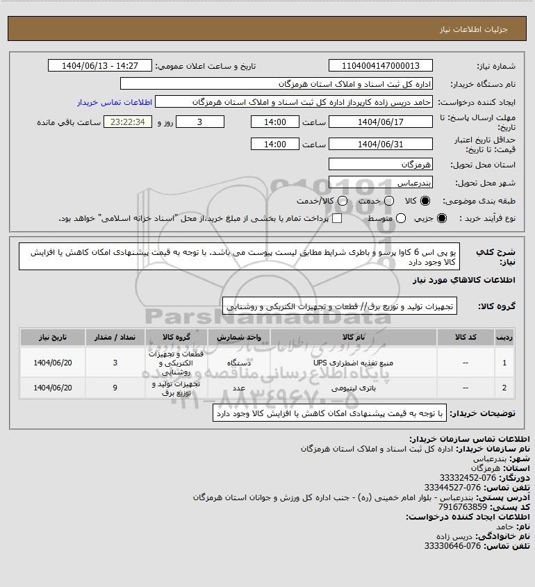شرح کلی نیاز: یو پی اس 6 کاوا پرسو و باطری شرایط مطابق لیست پیوست می باشد. با توجه به قیمت پیشنهادی امکان کاهش یا افزایش کالا وجود دارد