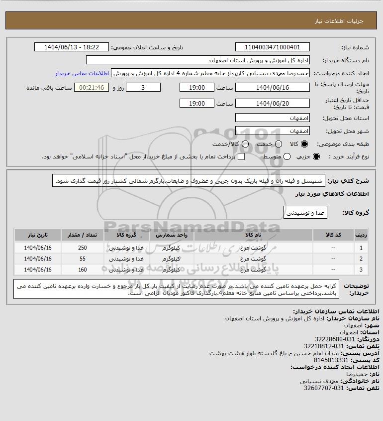 استعلام بها و موضوع استعلام استعلام شنیسل و فیله ران و فیله باریک بدون چربی و غضروف و ضایعات.بارگرم شمالی کشتار روز قیمت گذاری شود. به اطلاع کلیه شرکتها و افراد متخصص واجد شرایط میرساند، آگهی گذار در نظر دارد از طریق استعلام بها، نسبت به انتخاب و دریافت پیشنهادات اقدام نماید. این استعلام با کد آگهی ثبت شده در سامانه خبرگزاری پارس نماد : 9501044 منتشر شده است. مشخصات استعلام : تاریخ شروع استعلام: 1404/06/13 آخرین مهلت ارسال پیشنهاد قیمت : 1404/06/16 و محل اجرای پروژه : استان مناقصات استان اصفهان میباشد. استعلام قیمت مورد درخواست : استعلام شنیسل و فیله ران و فیله باریک بدون چربی و غضروف و ضایعات.بارگرم شمالی کشتار روز قیمت گذاری شود. با دستهبندیهای تخصصی و گروه های مرتبط : مواد غذایی, مواد پروتئینی, دام و طیور, استعلام اطلاع رسانی میگردد.