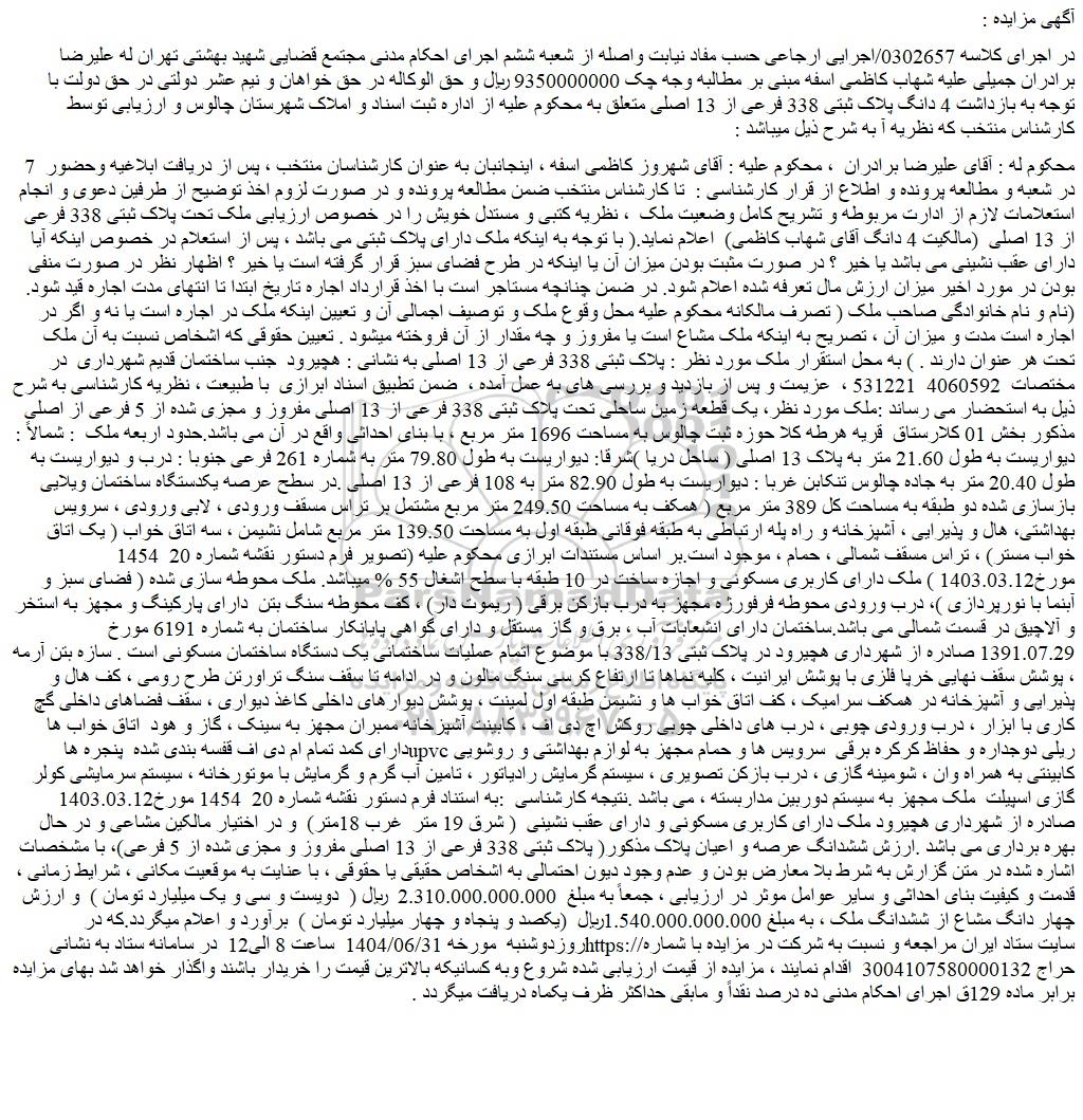 در اجرای کلاسه 0302657/اجرایی ارجاعی حسب مفاد نیابت واصله از شعبه ششم اجرای احکام مدنی مجتمع قضایی شهید بهشتی تهران له علیرضا برادران جمیلی علیه شهاب کاظمی اسفه مبنی بر مطالبه وجه چک 9350000000 ریال و حق الوکاله در حق خواهان و نیم عشر دولتی در حق دولت با توجه به بازداشت 4 دانگ پلاک ثبتی 338 فرعی از 13 اصلی متعلق به محکوم علیه از اداره ثبت اسناد و املاک شهرستان چالوس و ارزیابی توسط کارشناس منتخب که نظریه آ به شرح ذیل میباشد :