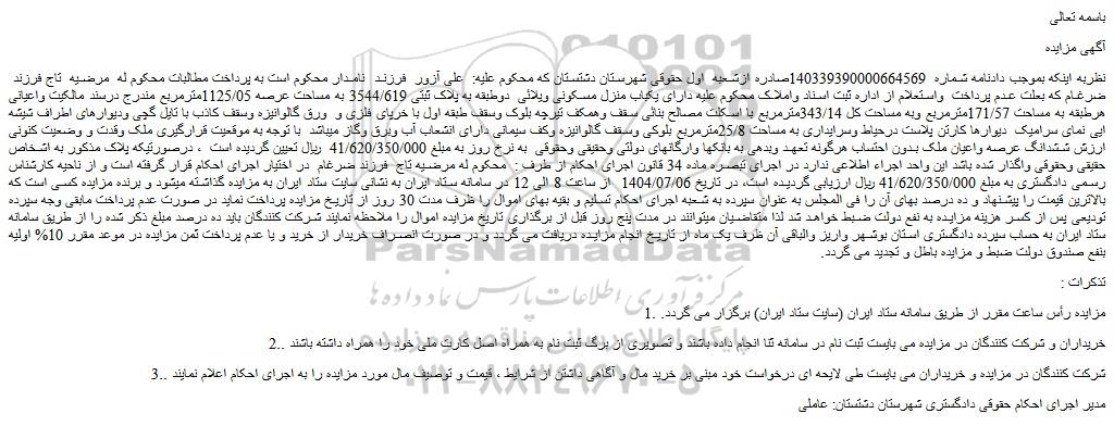نظربه اینکه بموجب دادنامه شماره 140339390000664569صادره ازشعبه اول حقوقی شهرستان دشتستان که محکوم علیه: علی آزور فرزند نامدار محکوم است به پرداخت مطالبات محکوم له مرضیه تاج فرزند ضرغام که بعلت عدم پرداخت واستعلام از اداره ثبت اسناد واملاک محکوم علیه دارای یکباب منزل مسکونی ویلائی دوطبقه به پلاک ثبتی 3544/619 به مساحت عرصه 1125/05مترمربع مندرج درسند مالکیت واعیانی هرطبقه به مساحت 171/57مترمربع وبه مساحت کل 343/14مترمربع با اسکلت مصالح بنائی سقف وهمکف تیرچه بلوک وسقف طبقه اول با خرپای فلزی و ورق گالوانیزه وسقف کاذب با تایل گچی ودیوارهای اطراف شیشه ایی نمای سرامیک دیوارها کارتن پلاست درحیاط وسرایداری به مساحت 25/8مترمربع بلوکی وسقف گالوانیزه وکف سیمانی دارای انشعاب آب وبرق وگاز میباشد با توجه به موقعیت قرارگیری ملک وقدت و وضعیت کنونی ارزش ششدانگ عرصه واعیان ملک بدون احتساب هرگونه تعهد وبدهی به بانکها وارگانهای دولتی وحقیقی وحقوقی به نرخ روز به مبلغ 41/620/350/000 ریال تعیین گردیده است ، درصورتیکه پلاک مذکور به اشخاص حقیقی وحقوقی واگذار شده باشد این واحد اجراء اطلاعی ندارد در اجرای تبصره ماده 34 قانون اجرای احکام از طرف : محکوم له مرضیه تاج فرزند ضرغام در اختیار اجرای احکام قرار گرفته است و از ناحیه کارشناس رسمی دادگستری به مبلغ 41/620/350/000 ریال ارزیابی گردیده است، در تاریخ 1404/07/06 از ساعت 8 الی 12 در سامانه ستاد ایران به نشانی سایت ستاد ایران به مزایده گذاشته میشود و برنده مزایده کسی است که بالاترین قیمت را پیشنهاد و ده درصد بهای آن را فی المجلس به عنوان سپرده به شعبه اجرای احکام تسلیم و بقیه بهای اموال را ظرف مدت 30 روز از تاریخ مزایده پرداخت نماید در صورت عدم پرداخت مابقی وجه سپرده تودیعی پس از کسر هزینه مزایده به نفع دولت ضبط خواهد شد لذا متقاضیان میتوانند در مدت پنج روز قبل از برگذاری تاریخ مزایده اموال را ملاحظه نمایند شرکت کنندگان باید ده درصد مبلغ ذکر شده را از طریق سامانه ستاد ایران به حساب سپرده دادگستری استان بوشهر واریز والباقی آن ظرف یک ماه از تاریخ انجام مزایده دریافت می گردد و در صورت انصراف خریدار از خرید و یا عدم پرداخت ثمن مزایده در موعد مقرر 10% اولیه بنفع صندوق دولت ضبط و مزایده باطل و تجدید می گردد.
