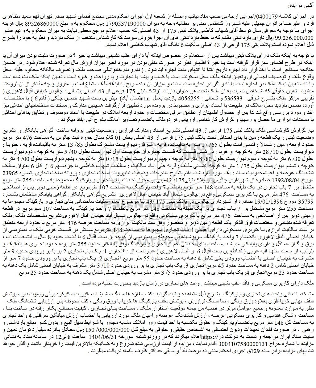 در اجرای کلاسه 0400179/اجرایی ارجاعی حسب مفاد نیاتب واصله از شعبه اول اجرای احکام مدنی مجتمع قضای شهید صدر تهران لهم سعید مظاهری فرد و علیرضا برادران جمیلی علیه شهروز کاظمی مبنی بر مطالبه وجه به میزان 1790537190000 ریال محکوم به و مبلغ 89526860000 ریال هزینه اجرای با توجه به معرفی مال توسط آقای شهاب کاظمی پلاک ثبتی 175 از 43 اصلی که حسب اعلام مرجع معطی نیابت به میزان محکوم به و نیم عشر 99.236.000.000 ریال دارای بازداشتی مقدم که با حفظ بازداشتی های آن اجرا بفروش میرسد که کارشناس منتخب از ملک بازدید و نظریه خود را بشرح ذیل اعلام نموده است:پلاک بتی 175 فرعی از 43 اصلی مالکیت 6 دانگ آقای شهاب کاظمی اعلام نماید.