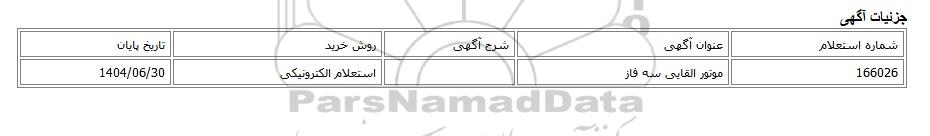 | 166026 | موتور القایی سه فاز | استعلام الکترونیکی | 1404/06/30 |