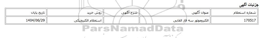 | 170517 | الکتروموتور سه فاز القایی | استعلام الکترونیکی | 1404/06/29 |