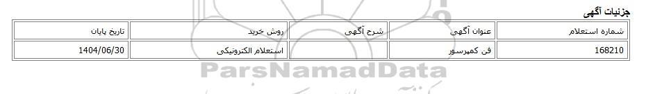 | 168210 | فن کمپرسور | استعلام الکترونیکی | 1404/06/30 |