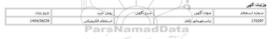 | 170297 | ترانسفورماتور تکفاز | استعلام الکترونیکی | 1404/06/29 |