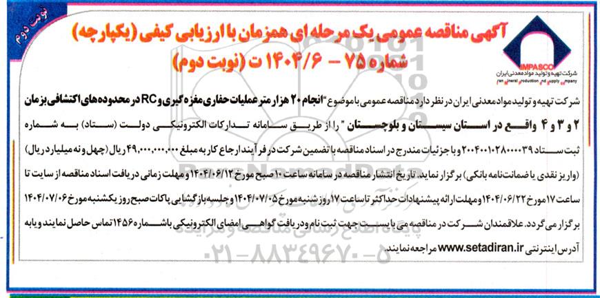 شرکت تهیه و تولید مواد معدنی ایران در نظر دارد مناقصه عمومی با موضوع "انجام 20 هزار متر عملیات حفاری مغزه گیری و RC در محدوده های اکتشافی بزمان 2 و3 و 4 واقع در استان سیستان و بلوچستان " را از طریق سامانه تدارکات الکترونیکی دولت (ستاد) به شماره ثبت ستاد 2004001028000039 و با جزئیات مندرج در اسناد مناقصه با تضمین شرکت در فرآیند ارجاع کار به مبلغ 49.000.000.000 ریال چهل و نه میلیارد ریال واریز نقدی یا ضمانت نامه بانکی برگزار نماید تاریخ انتشار مناقصه در سامانه سناعت 10 صبح مورخ 1404.6.12 و مهلت زمانی دریافت اسناد مناقصه از سایت تا ساعت 17 مورخ 1404.06.22 و مهلت ارائه پیشنهادات حداکثر تا ساعت 17 روز شنبه مورخ 1404.07.05 و جلسه بازگشایی پاکات صبح روز یکشنبه مورخ 1404.07.06 برگزار می گردد. علاقمندان شرکت در مناقصه می بایست جهت ثبت نام و دریافت گواهی امضای الکترونیکی باشماره 1456تماس حاصل نمایند و یا به آدرس اینترنتی ستاد ایران مراجعه نمایند.