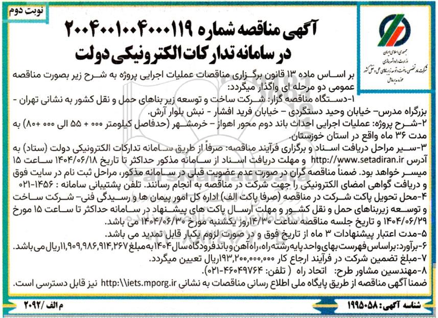 آگهی مناقصه شماره 2004001004000119 در سامانه تدارکات الکترونیکی دولت - نوبت دوم