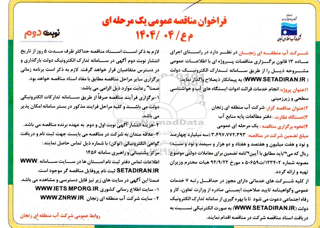 شرکت آب منطقه ای زنجان در نظر دارد در راستای اجرای ماده 13 قانون برگزاری مناقصات پروژه ای با اطلاعات عمومی مشروحه ذیل را از طریق سامانه تدارک الکترونیک دولت ستاد ایران به پیمانکار ذیصلاح واگذار نماید.