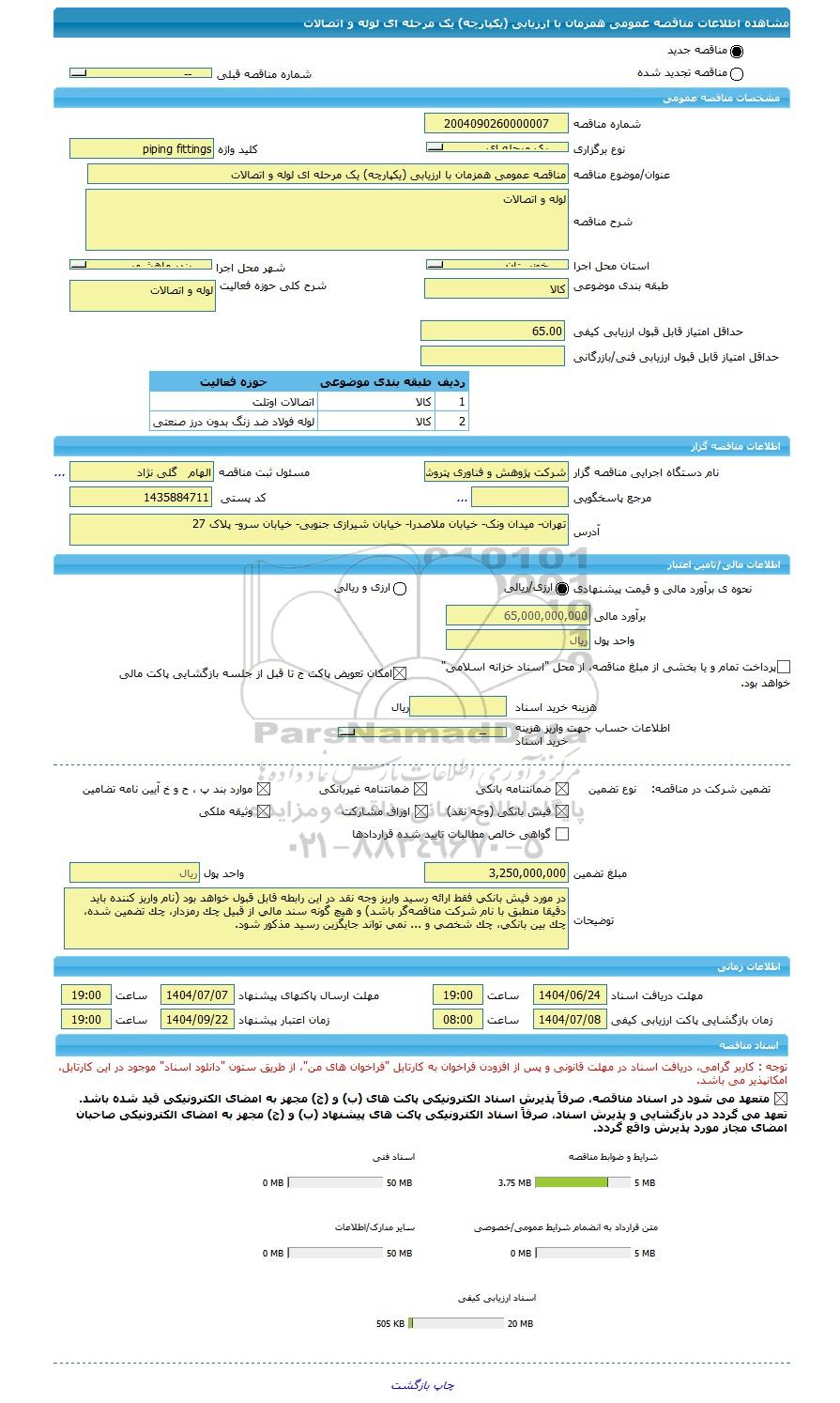 | شماره مناقصه | 2004090260000007 | |||||||||||