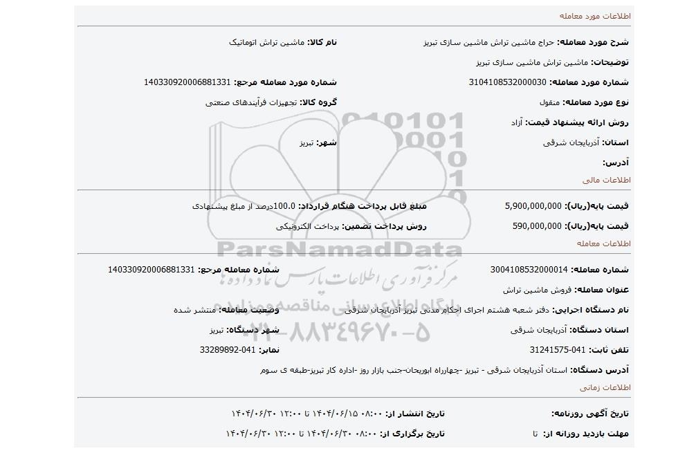 مزایده ماشین تراش ماشین سازی تبریز, مزایده، ماشین تراش ماشین سازی تبریز