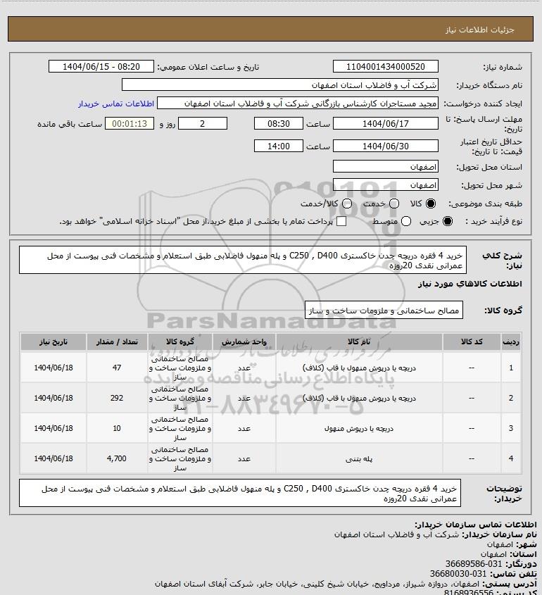 استعلام بها و موضوع استعلام استعلام خرید 4 فقره دریچه چدن خاکستری C250 , D400 و پله منهول فاضلابی طبق استعلام و مشخصات فنی پیوست از محل عمرانی نقدی 20روزه به اطلاع کلیه شرکت‌ها و افراد متخصص واجد شرایط می‌رساند، آگهی گذار در نظر دارد از طریق استعلام بها، نسبت به انتخاب و دریافت پیشنهادات اقدام نماید. این استعلام با کد آگهی ثبت شده در سامانه خبرگزاری پارس نماد : 9502450 منتشر شده است. مشخصات استعلام : تاریخ شروع استعلام: 1404/06/15 آخرین مهلت ارسال پیشنهاد قیمت : 1404/06/17 و محل اجرای پروژه : استان اصفهان میباشد. استعلام قیمت مورد درخواست : استعلام خرید 4 فقره دریچه چدن خاکستری C250 , D400 و پله منهول فاضلابی طبق استعلام و مشخصات فنی پیوست از محل عمرانی نقدی 20روزه با دسته‌بندی‌های تخصصی و گروه های مرتبط : قطعات بتنی, قطعات چدنی و فولادی, مصالح ساختمانی, استعلام اطلاع رسانی میگردد. شرایط شرکت در استعلام آنلاین : ابتدا ثبت نام در سامانه استعلام پارس نماد و تکمیل مدارک موردنیاز و بارگذاری در سامانه رعایت تمامی ضوابط و الزامات مندرج در اسناد استعلام است.