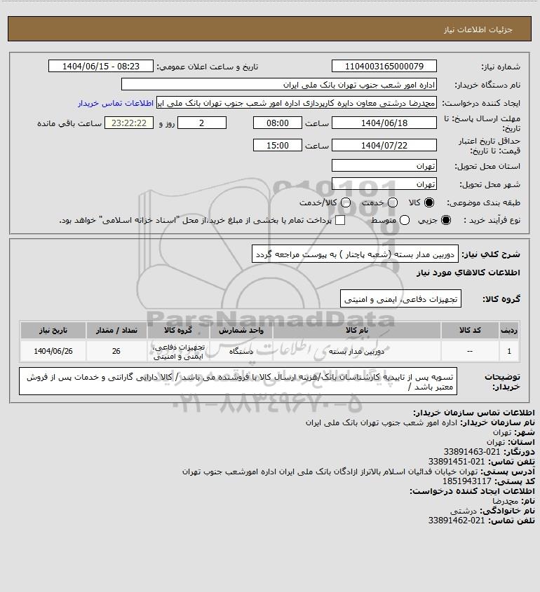 نام دستگاه خریدار:اداره امور شعب جنوب تهران بانک ملی ایران
