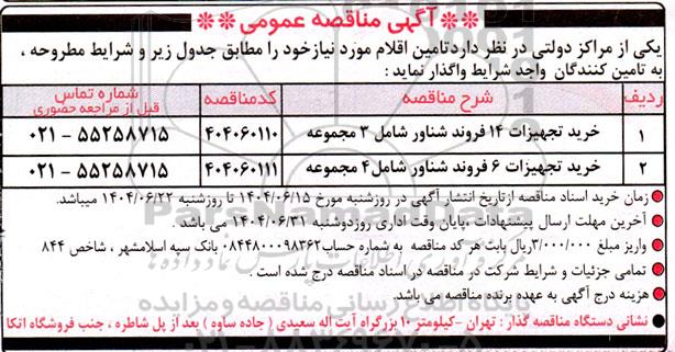 | خرید تجهیزات 14 فروند شناور شامل 3 مجموعه | 404060110 | 55258715 -021 |