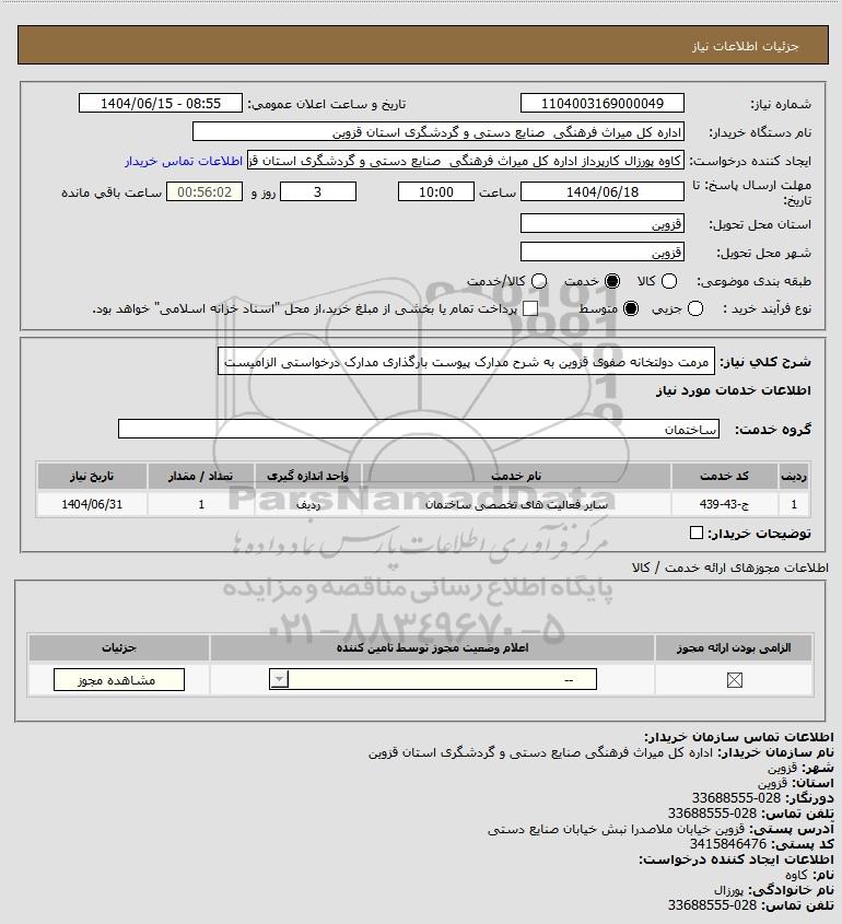 نام دستگاه خریدار:اداره کل میراث فرهنگی صنایع دستی و گردشگری استان قزوین