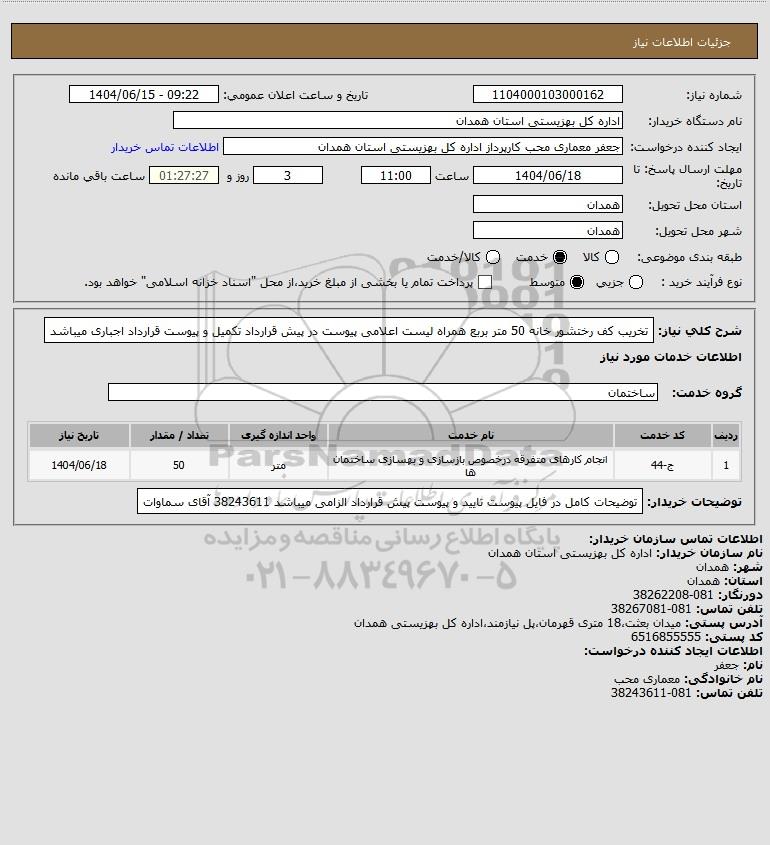 شرح کلی نیاز: تخریب کف رختشور خانه 50 متر بربع همراه لیست اعلامی پیوست در پیش قرارداد تکمیل و پیوست قرارداد اجباری میباشد