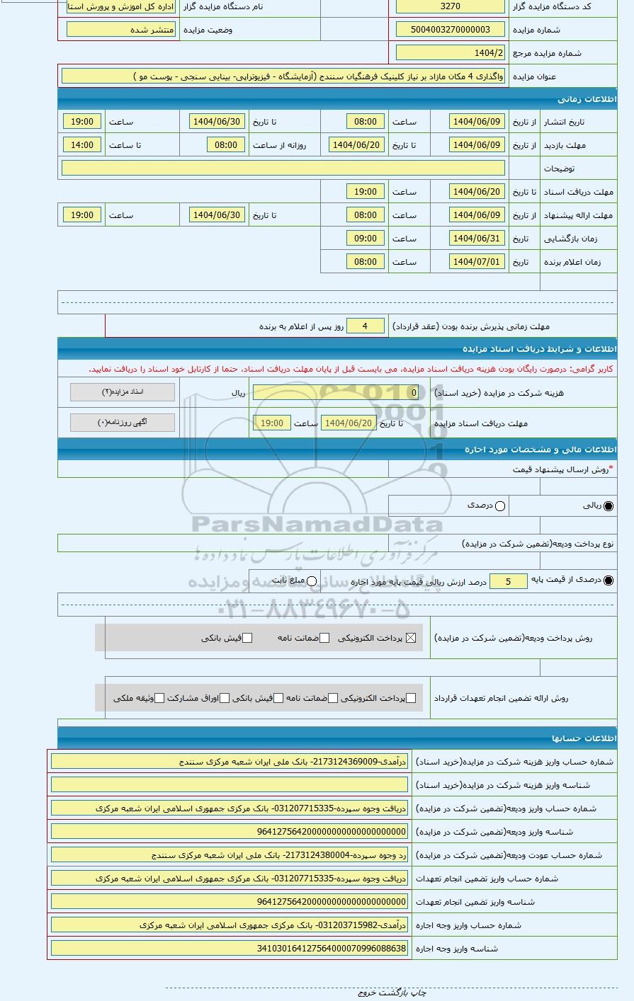 | کد مزایده گزار | 3270 | نام دستگاه مزایده گزار | اداره کل اموزش و پرورش استان کردستان | |