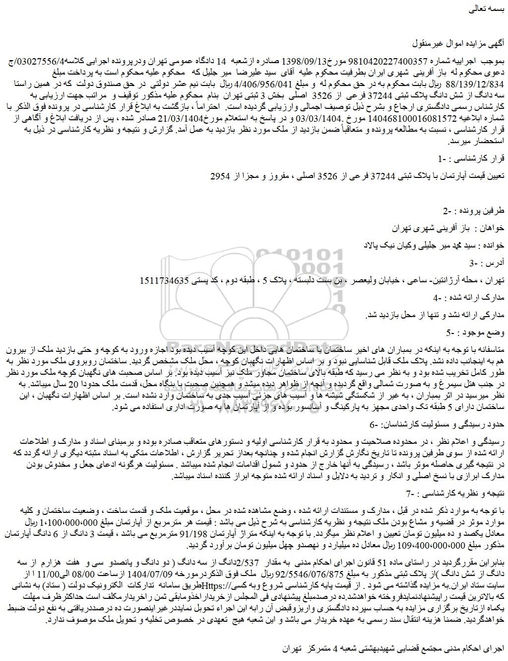 بموجب  اجراییه شماره 9810420227400357 مورخ1398/09/13 صادره ازشعبه  14 دادگاه عمومی تهران ودرپرونده اجرایی کلاسه03027556/4/ج  دعوی محکوم له  باز آفرینی  شهری ایران بطرفیت محکوم علیه  آقای  سید علیرضا  میر جلیل که   محکوم علیه محکوم است به پرداخت مبلغ 88/139/12/834  ریال بابت محکوم به در حق محکوم له  و مبلغ 4/406/956/041 ریال  بابت نیم عشر دولتی  در حق صندوق دولت  که در همین راستا سه دانگ از شش دانگ پلاک ثبتی 37244 فرعی  از 3526  اصلی  بخش 3 ثبتی تهران  بنام  محکوم علیه مذکور توقیف و  مراتب جهت ارزیابی به کارشناس رسمی دادگستری ارجاع و بشرح ذیل توصیف اجمالی وارزیابی گردیده است.  احتراماً ، بازگشت به ابلاغ قرار کارشناسی در پرونده فوق الذکر با شماره ابلاغیه 140468100016081572 مورخ .03/03/1404 و در پاسخ به استعلام مورخ21/03/1404 صادر شده ، پس از دریافت ابلاغ و آگاهی از قرار کارشناسی ، نسبت به مطالعه پرونده و متعاقباً ضمن بازدید از ملک مورد نظر بازدید به عمل آمد. گزارش و نتیجه و نظریه کارشناسی در ذیل به استحضار میرسد.