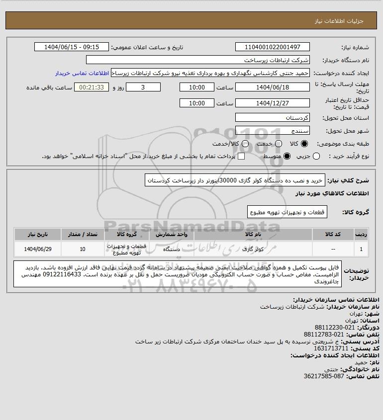 شرح کلی نیاز: خرید و نصب ده دستگاه کولر گازی 30000اینورتر دار زیرساخت کردستان