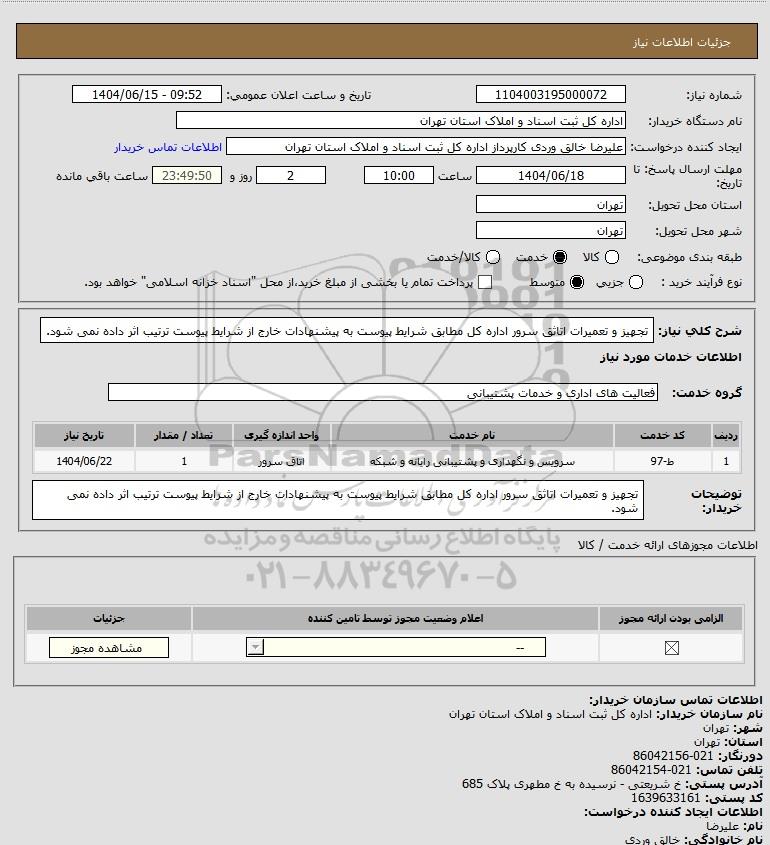 شرح کلی نیاز: تجهیز و تعمیرات اتاثق سرور اداره کل مطابق شرایط پیوست
