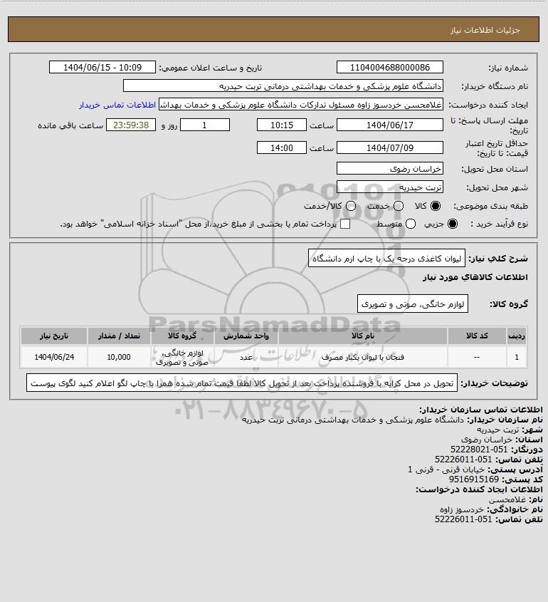 شرح کلی نیاز: لیوان  کاغذی درجه یک با چاپ ارم دانشگاه