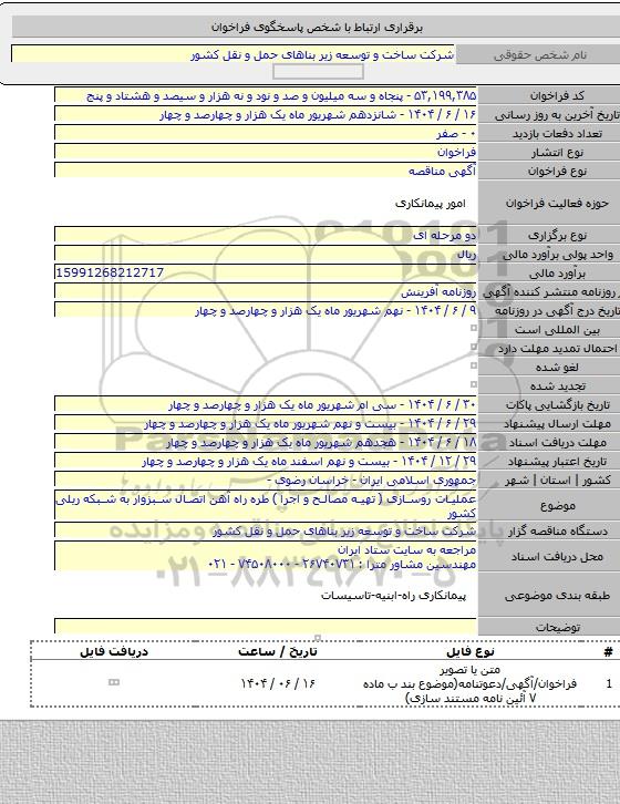 آخرین دریافت پیشنهادها و تاریخ بازگشایی پاکتها و اطلاعات دقیقتر درباره شرایط این مناقصه و نحوه ارسال مدارک، و الزامات پروژه در اطلاعات تکمیلی این آگهی مناقصه درج شده است. لطفا ثبت نام کنید تا اطلاعات کامل را ببینید. علاقهمندان میتوانند جهت دریافت اسناد و اطلاعات تکمیلی، مناقصه عملیات روسازی ( تهیه مصالح و اجرا ) طره راه آهن اتصال سبزوار به شبکه ریلی کشور با سامانه مناقصات و مزایدات ایران پارسنماد داده ها 88349670 تماس حاصل نمایند.