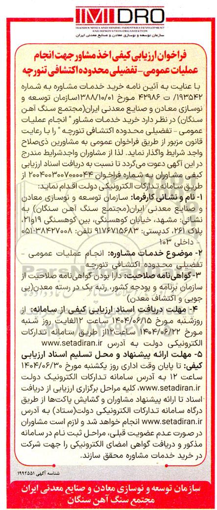 با عنایت به آئین نامه خرید خدمات مشاوره به شماره 193542 ت 42986 مورخ 1388.10.01 سازمان توسعه و نوسازی معادن و صنایع معدنی ایران مجتمع سنگ آهن سنگان در نظر دارد خرید خدمات مشاور " انجام عملیات عمومی - تفضیلی محدوده اکتشافی تنورچه" را با رعایت قانون مزبور از طریق فراخوان عمومی به مشاورین ذی صلاحواجد شرایط واگذار نماید لذا از مشاوران واجد شرایط مندرج در این آگهی دعوت میگردد تا نسبت به دریافت اسناد ارزیابی کیفی مشاوران به شماره فراخوان 2004003007000044 از طریق سامانه تدارکات الکترونیکی دولت اقدام نماید