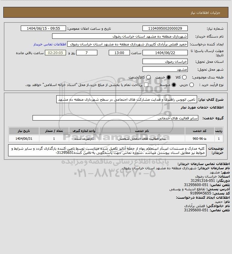 شرح کلی نیاز: تامین اتوبوس راهبری و هدایت مشارکت های اجتماعی در سطح شهرداری منطقه ده مشهد