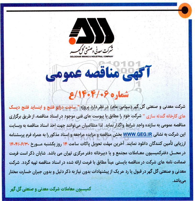 شرکت معدنی و صنعتی گل گهر (سهامی عام) در نظر دارد پروژه " ساخت درایو فلنج و اینساید فلنج دیسک های کارخانه گندله سازی" شرکت خود را مطابق با پیوست های فنی موجود در اسناد مناقصه از طریق برگزاری مناقصه عمومی به سازنده واجد شرایط واگذار نماید. لذا متقاضیان میتوانند جهت اخذ اسناد مناقصه به وبسایت این شرکت به نشانی بخش مناقصه و مزایده مراجعه WWW.GEG.IR و اسناد مذکور را به همراه فرم پرسشنامه ارزیابی تأمین کنندگان دانلود نمایند آخرین مهلت تحویل پاکات ساعت 14 روز یکشنبه مورخ 1404.06.30 در محل دفتر کمیسیون معاملات مجتمع و یا دبیرخانه دفتر مرکزی تهران میباشد. شایان ذکر است فرمت ضمانت نامه های شرکت در مناقصه بایستی عیناً مطابق با فرمت ارائه شده در اسناد مناقصه تهیه گردد. شرکت معدنی و صنعتی گل گهر در قبول یا رد هر یک از پیشنهادات بدون نیاز به ذکر دلیل و بدون جبران خسارت مختار میباشد.