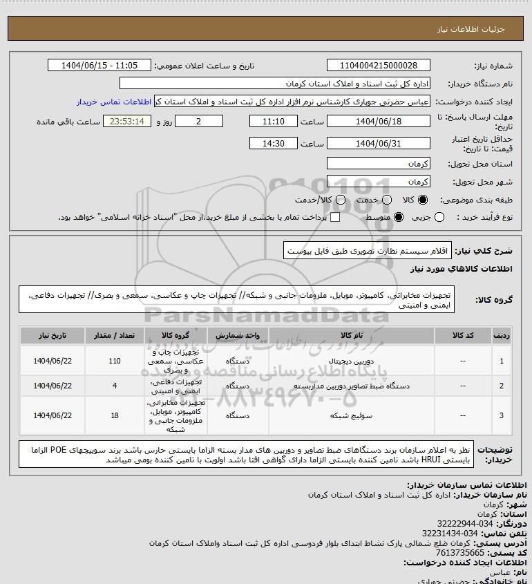 توضیحات خریدار:نظر به اعلام سازمان برند دستگاهای ضبط تصاویر و دوربین های مدار بسته الزاما بایستی حارس باشد برند سوییچهای POE الزاما بایستی HRUI باشد تامین کننده بایستی الزاما دارای گواهی افتا باشد اولویت با تامین کننده بومی میباشد
