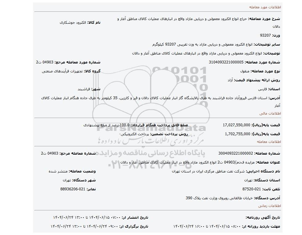 | عنوان معامله: مزایده فنم/04903 ت2 انواع الکترود مازاد واقع در انبار عملیات کالای مناطق آغار و دالان | ||
