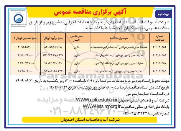مناقصه عملیات مدیریت بهره برداری آب و مشترکین منطقه...- نوبت دوم از کلیه افراد متخصص و شرکتها واجد شرایط دعوت به عمل میآید در مناقصه با کد خبرگزاری پارس نماد: 9505669 شرکت نمایند.