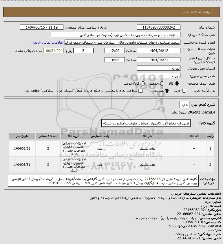 | 2 | -- | هارد دیسک | عدد | تجهیزات مخابراتی، کامپیوتر، موبایل، ملزومات جانبی و شبکه | 3 | 1404/06/31 |