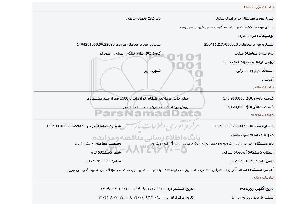 نام دستگاه اجرایی: دفتر شعبه هفدهم اجرای احکام مدنی تبریز آذربایجان شرقیوضعیت معامله: منتشر شده