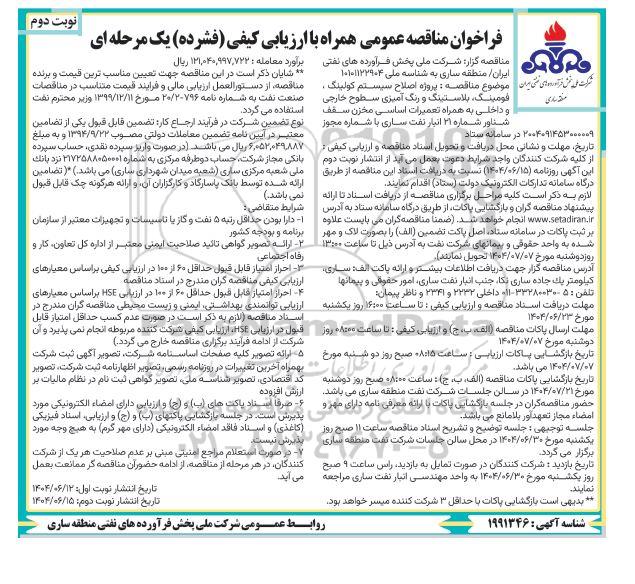 فراخوان مناقصه عمومی همراه با ارزیابی کیفی (فشرده) یک مرحله ای ؟ نوبت دوم
