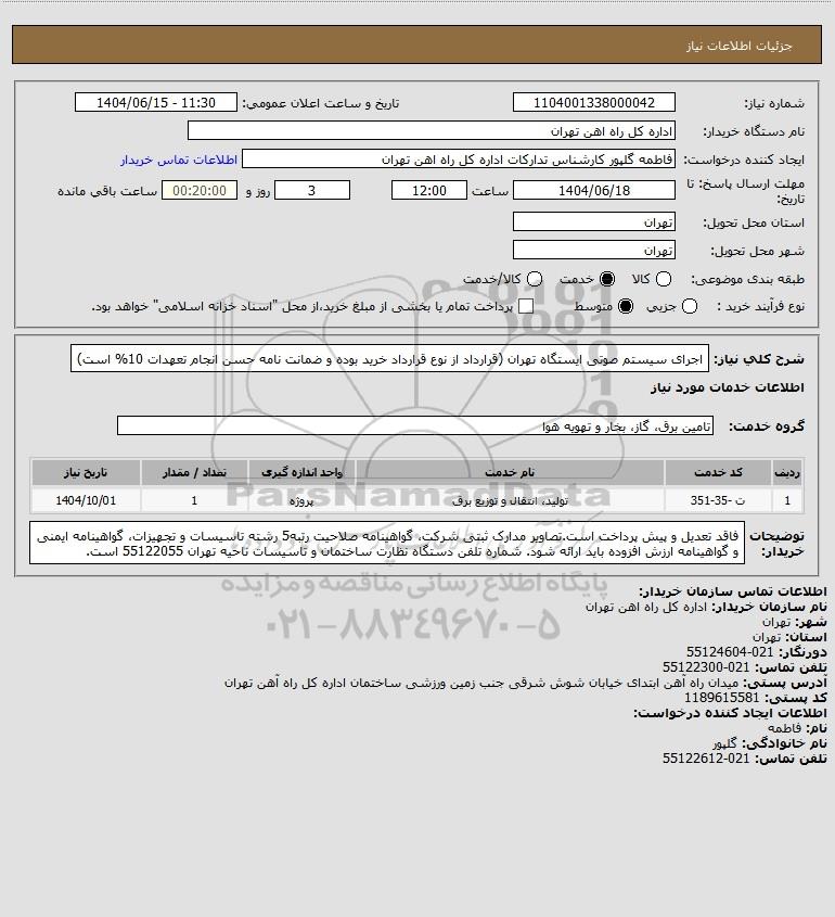 شرح کلی نیاز: اجرای سیستم صوتی ایستگاه تهران (قرارداد از نوع قرارداد خرید بوده و ضمانت نامه حسن انجام تعهدات 10% است)