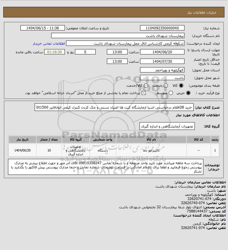 شرح کلی نیاز: خرید 28اقلام درخواستی اشیا ازمایشگاه کیت ها اغتیاد تستی و چک کردن کنترل کیفی اتوانالایزر bt1500